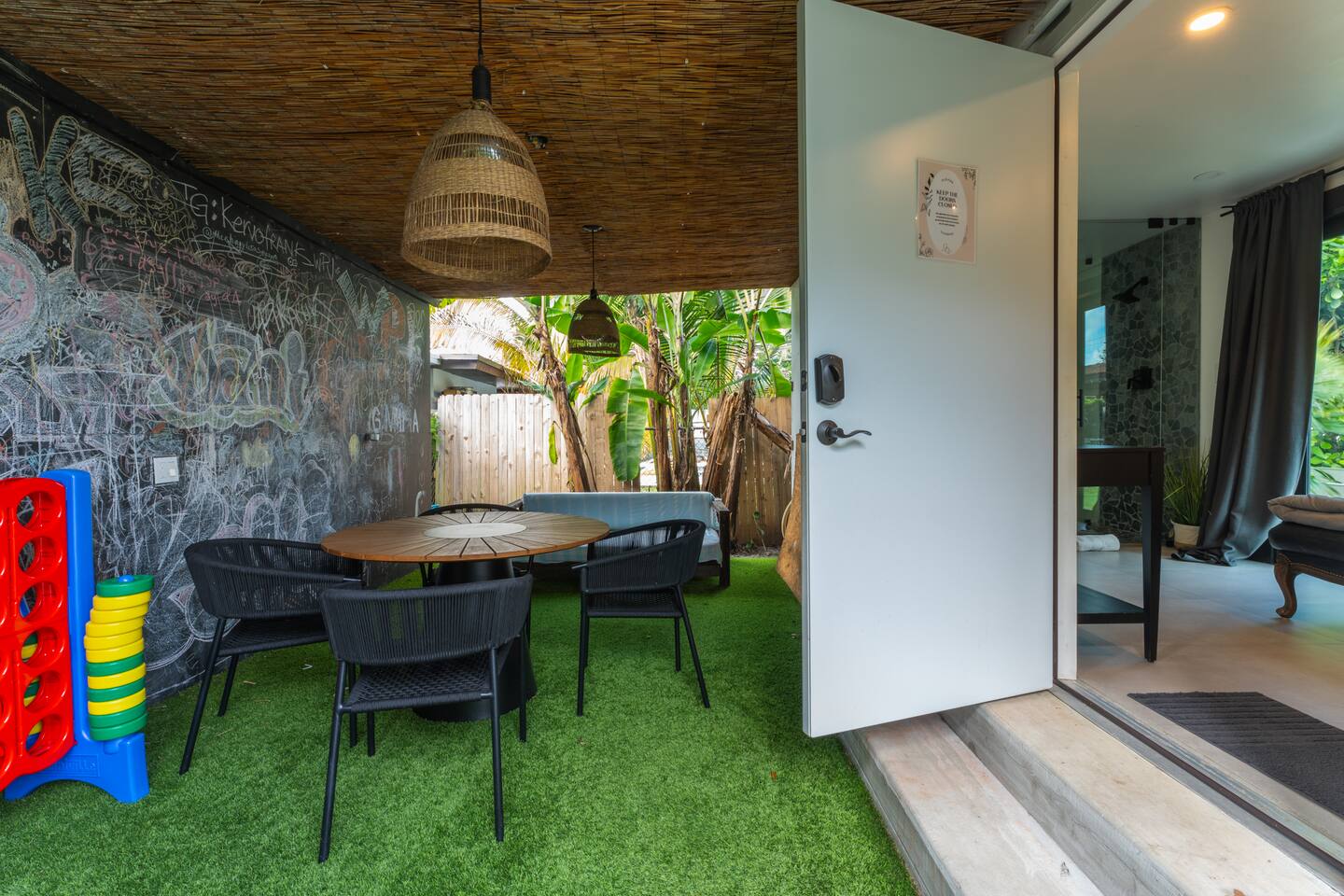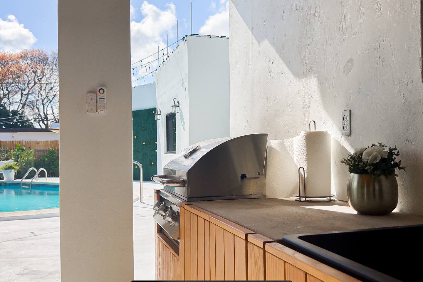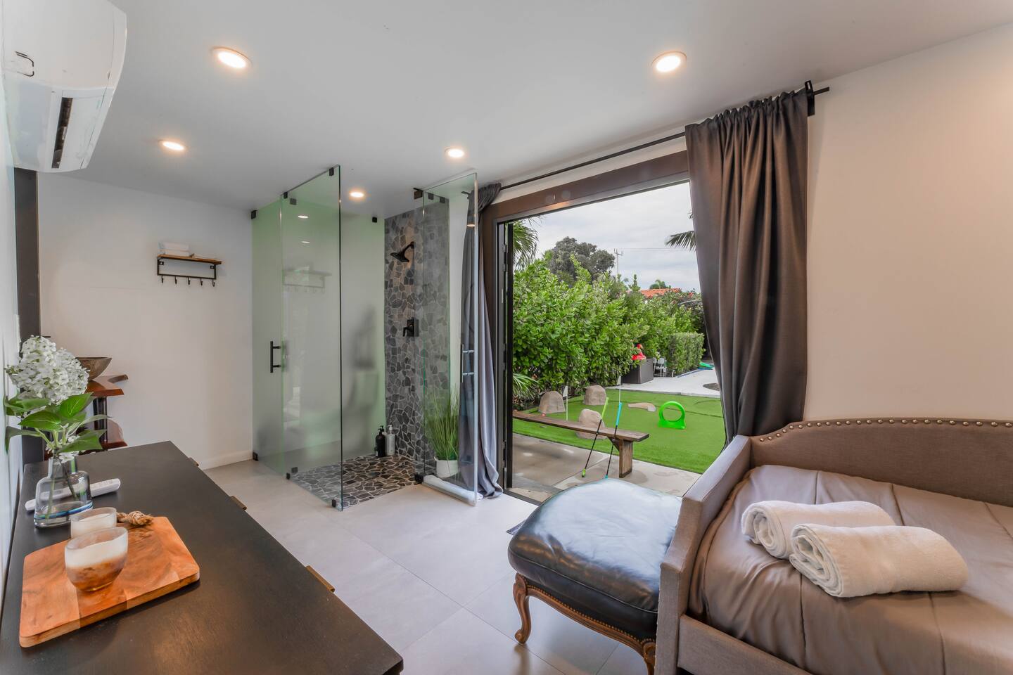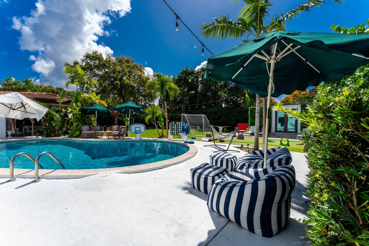 Villa Esperanza is a carefully curated Mediterranean Villa, centrally located and a short distance to all areas of interest. Miami International Airport - 5 miles, less than 15 minutes Coral Gables - 2 miles, 10 minutes Coconut Grove - 1.4 miles, 5 minutes Brickell - 3.7 miles, 12 minutes Downtown - 5 miles, 13 minutes Midtown - 7 miles, 15 minutes Miami Beach - 11 miles, 18 minutes South Beach - 9.5 miles, 20 minutes -The home features a large deep pool, large gazebo with outdoor kitchen, massive backyard with multiple games(putt putt, corn hole, soccer, pool basketball, ring toss, connect 4 and beautiful landscaping. -Laundry room the size of a small kitchen. -Five bedrooms, 3 on the first floor, one on the second floor which has its own private rooftop terrace and doubles as an office and the fifth is a converted shipping container with a full bathroom and AC. -Spacious living room and a chef's dream kitchen with 10 foot island and wrap around counter-tops. -Primary bedroom with pool & backyard views, primary bath with soaking tub and double shower head. -Bedrooms 2 & 3 each with queen beds. -Bedroom 4 & 5 with twin daybeds and trundles.