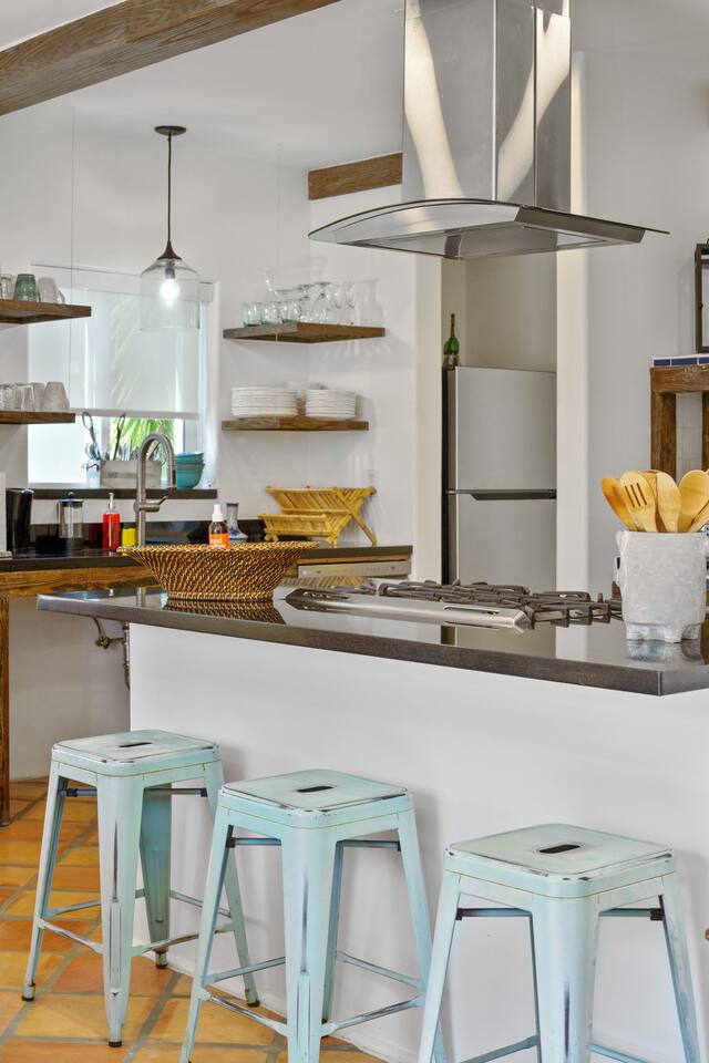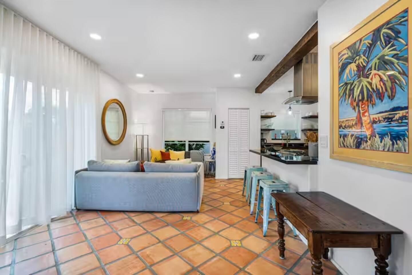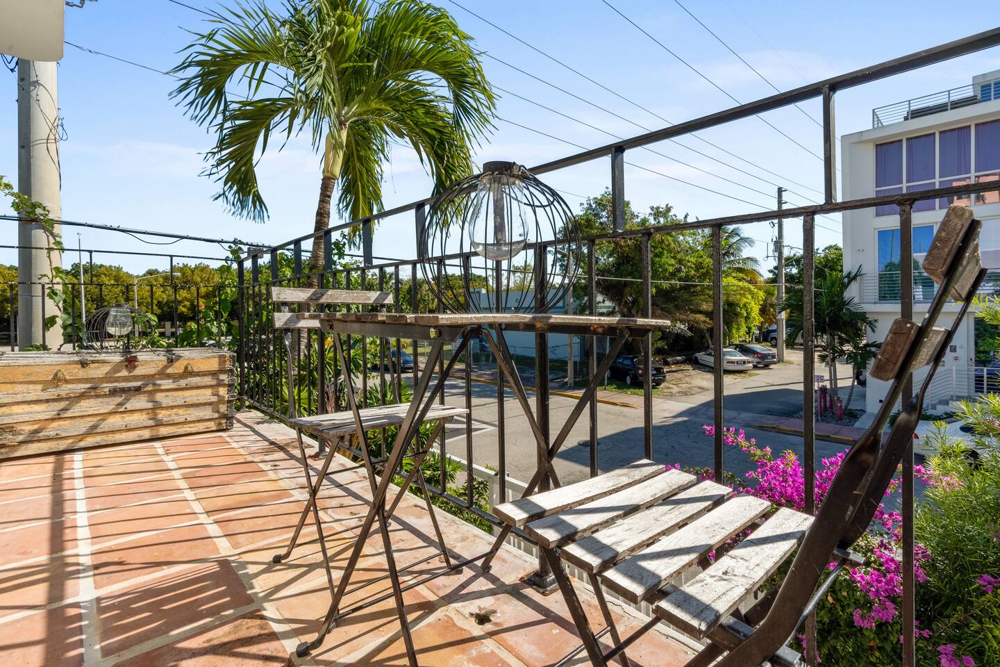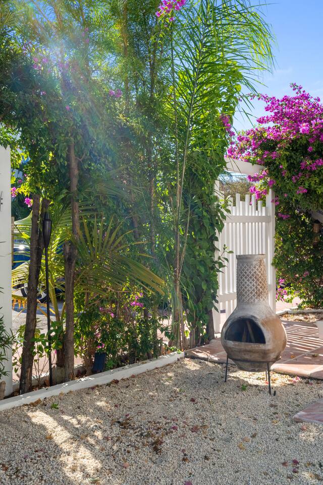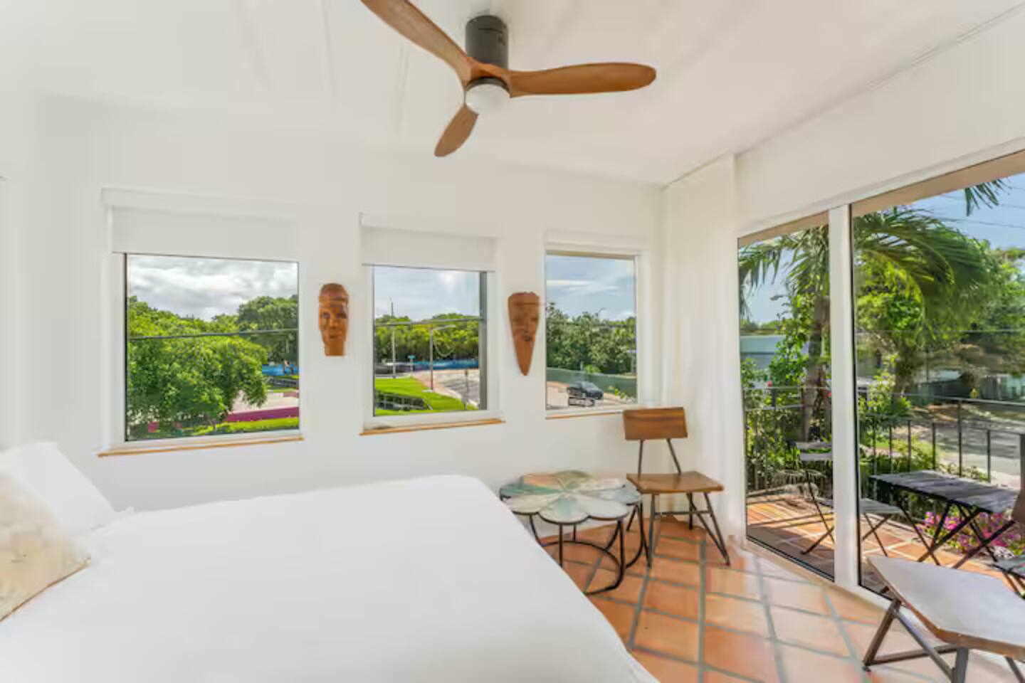 This Miami Beach upstairs retreat blends style, comfort, and a touch of tropical charm. 🛏️ Bedrooms - Bedroom 1: Queen bed, en-suite bathroom, and Smart TV. - Bedroom 2: King bed surrounded by wraparound windows and lush garden views. 🚿 Bathrooms Two full bathrooms: one private en-suite and one shared, each featuring elegant tilework and walk-in showers. 🍳 Kitchen Warm and fully equipped with modern appliances, open shelving, and bar seating—perfect for casual meals or morning coffee. 🛋️ Living Room Inviting space with cozy sofas, Smart TV, and plenty of natural light—ideal for movie nights. 🌴 Outdoor Space (Shared) Access to a balcony with garden views and the shared patio area with outdoor seating for dining or relaxing under the Miami sun.