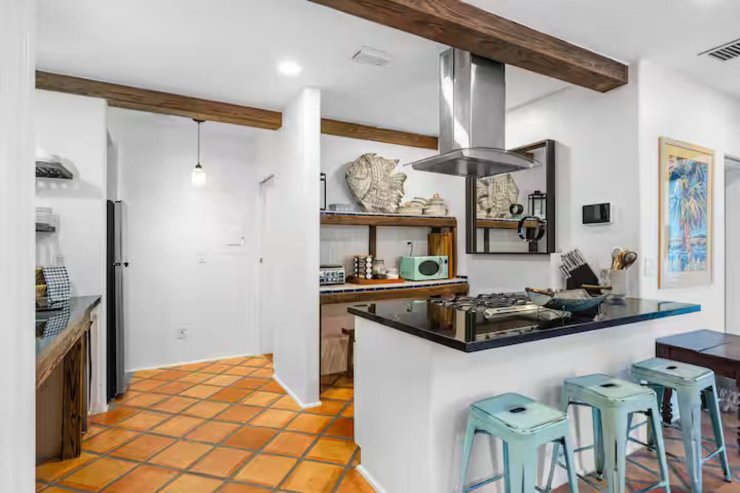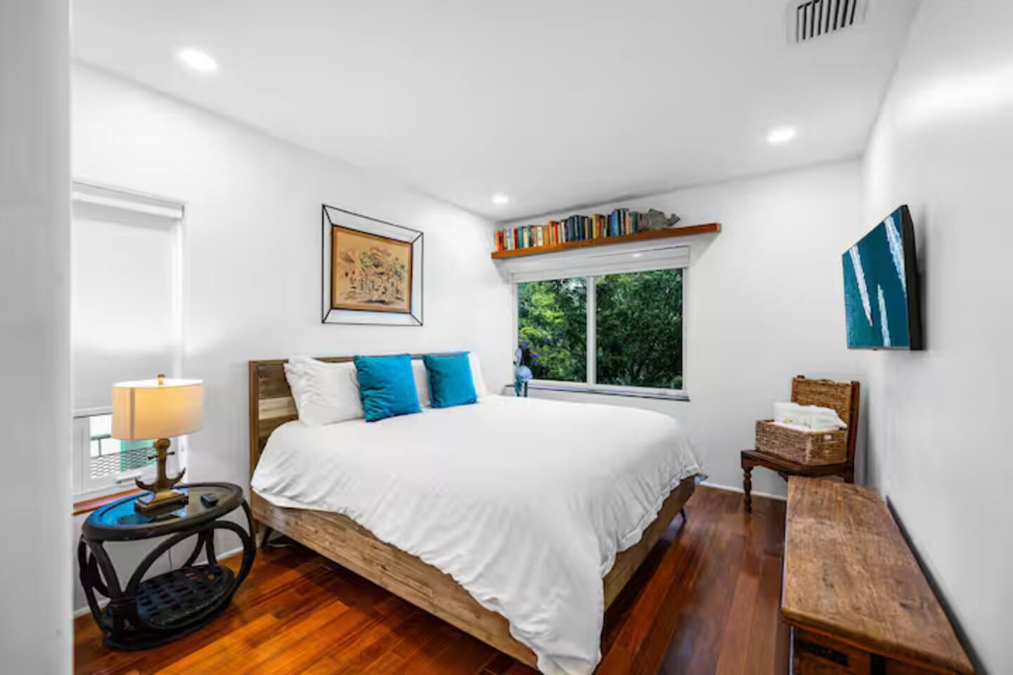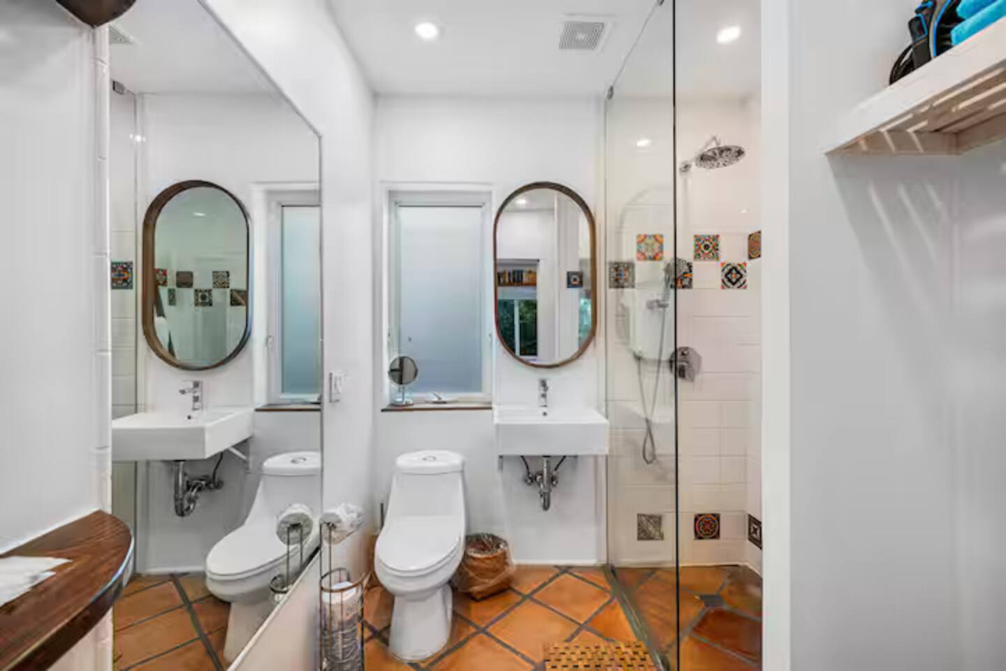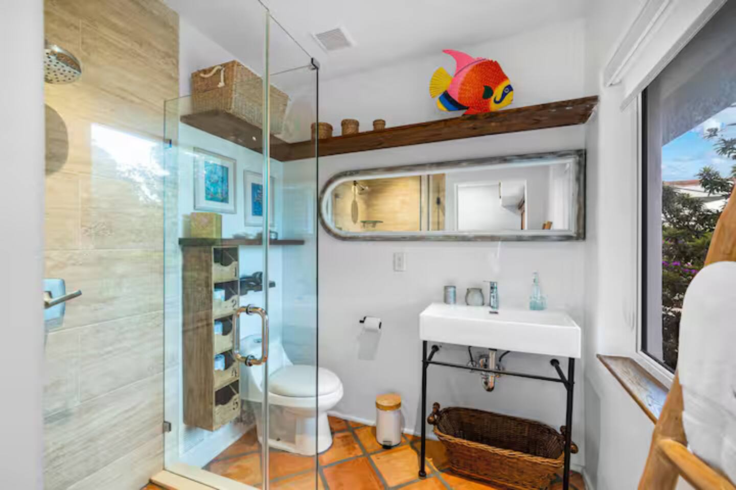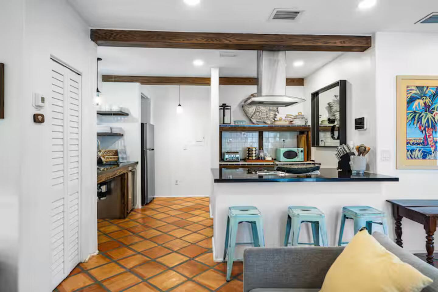 This Miami Beach upstairs retreat blends style, comfort, and a touch of tropical charm. 🛏️ Bedrooms - Bedroom 1: Queen bed, en-suite bathroom, and Smart TV. - Bedroom 2: King bed surrounded by wraparound windows and lush garden views. 🚿 Bathrooms Two full bathrooms: one private en-suite and one shared, each featuring elegant tilework and walk-in showers. 🍳 Kitchen Warm and fully equipped with modern appliances, open shelving, and bar seating—perfect for casual meals or morning coffee. 🛋️ Living Room Inviting space with cozy sofas, Smart TV, and plenty of natural light—ideal for movie nights. 🌴 Outdoor Space (Shared) Access to a balcony with garden views and the shared patio area with outdoor seating for dining or relaxing under the Miami sun.