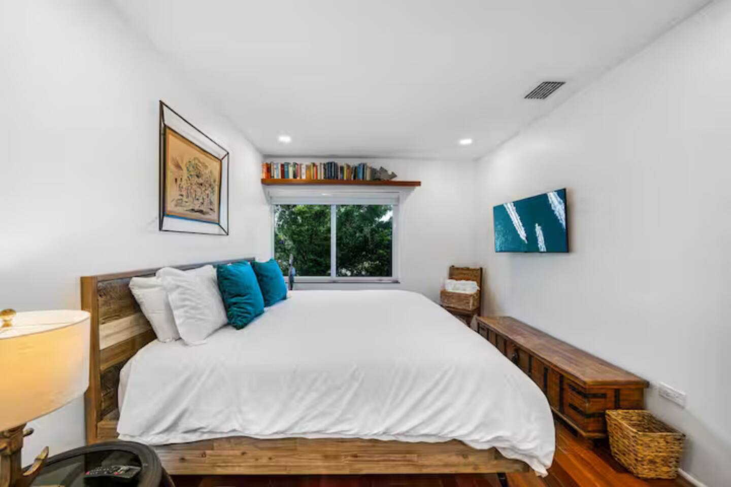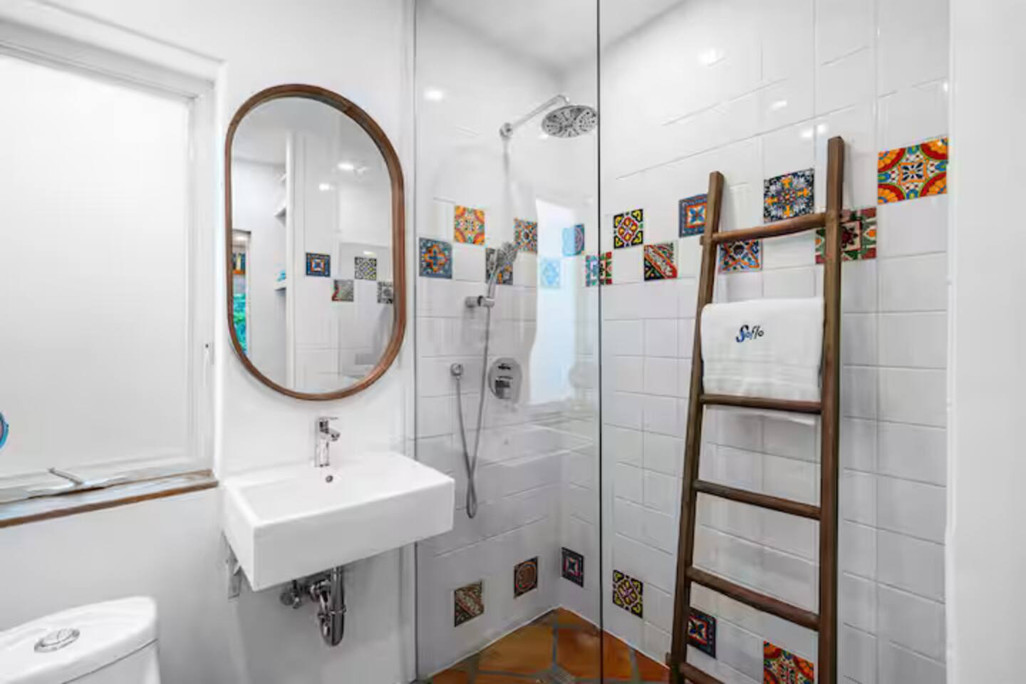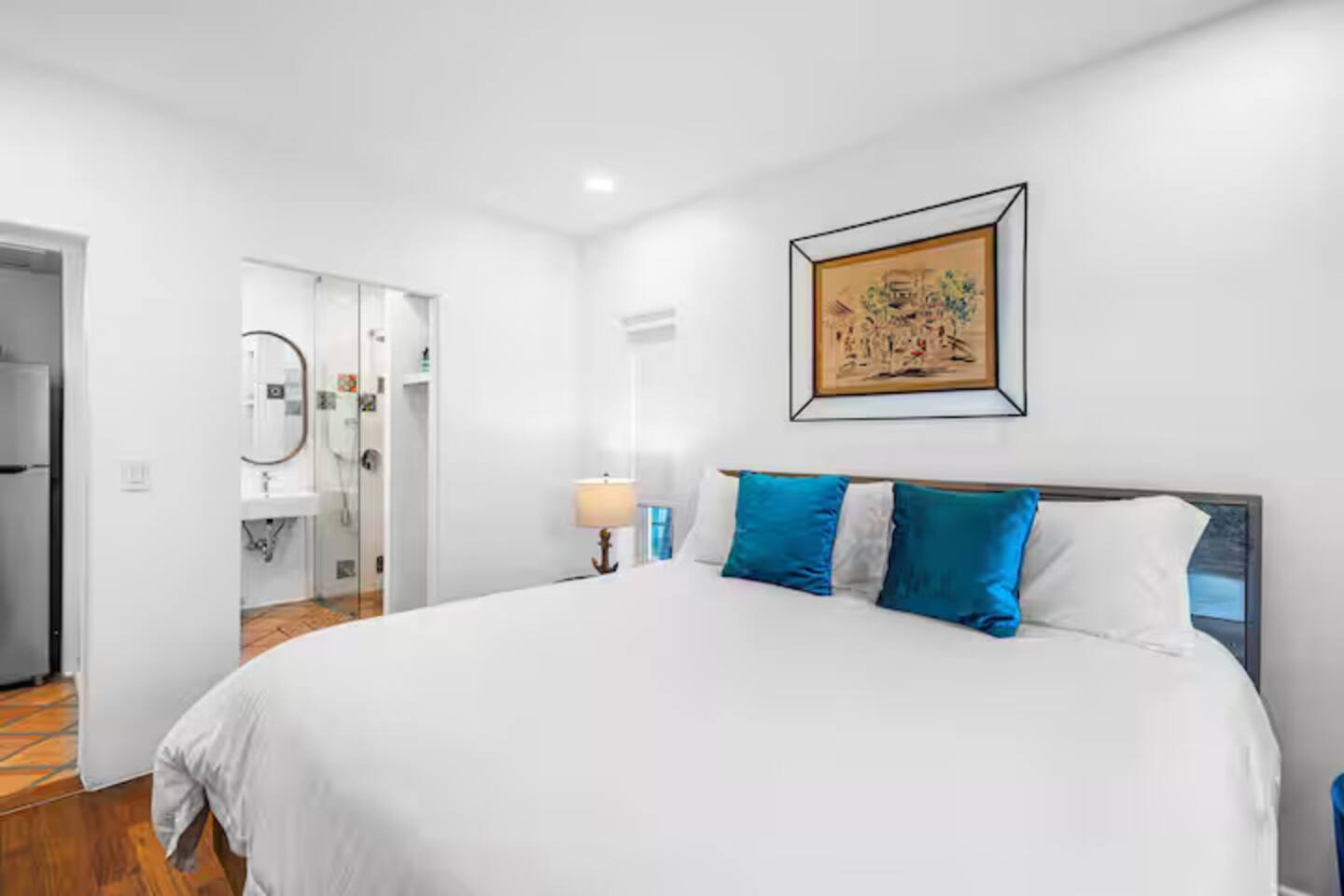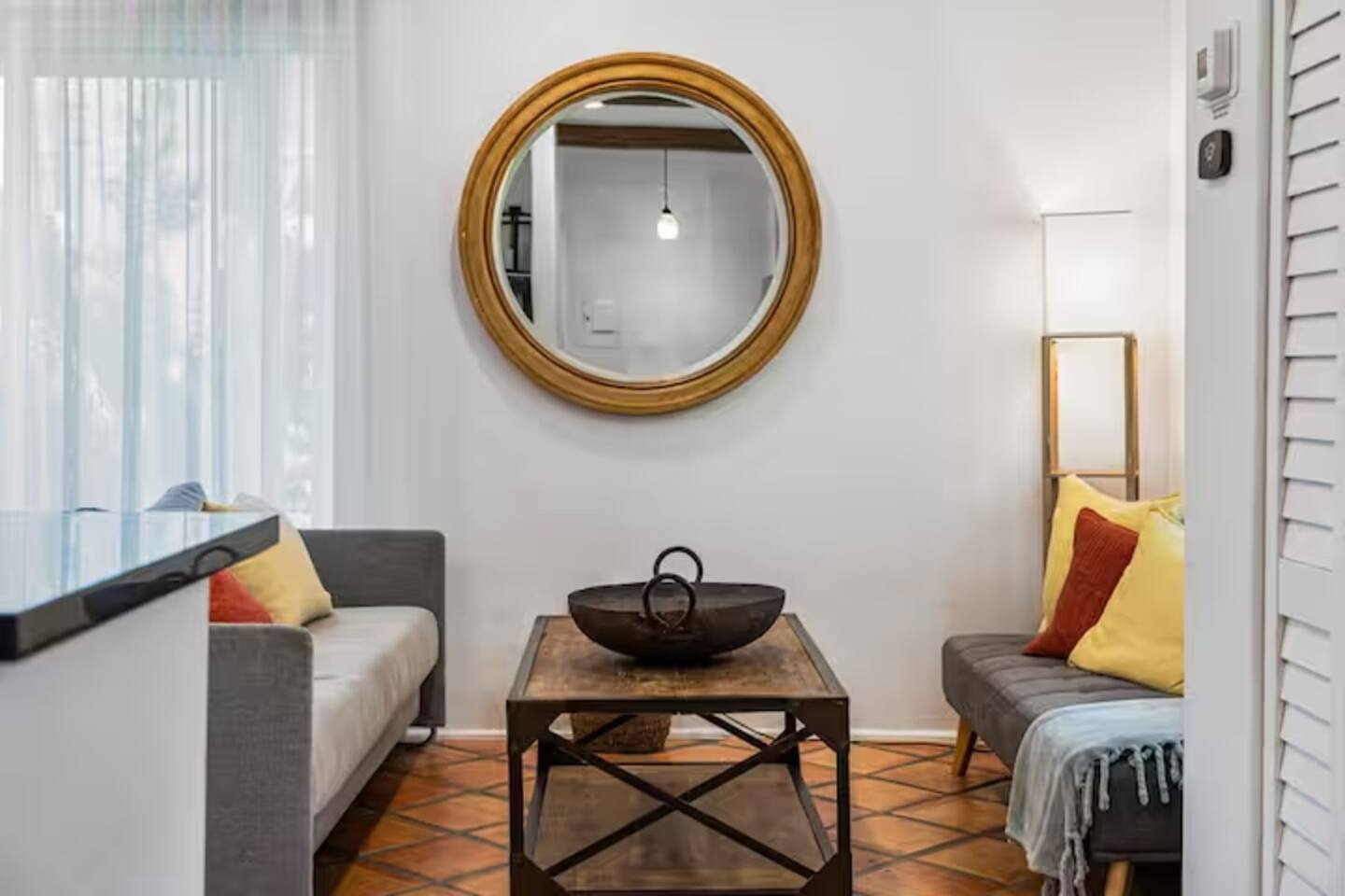 This Miami Beach upstairs retreat blends style, comfort, and a touch of tropical charm. 🛏️ Bedrooms - Bedroom 1: Queen bed, en-suite bathroom, and Smart TV. - Bedroom 2: King bed surrounded by wraparound windows and lush garden views. 🚿 Bathrooms Two full bathrooms: one private en-suite and one shared, each featuring elegant tilework and walk-in showers. 🍳 Kitchen Warm and fully equipped with modern appliances, open shelving, and bar seating—perfect for casual meals or morning coffee. 🛋️ Living Room Inviting space with cozy sofas, Smart TV, and plenty of natural light—ideal for movie nights. 🌴 Outdoor Space (Shared) Access to a balcony with garden views and the shared patio area with outdoor seating for dining or relaxing under the Miami sun.